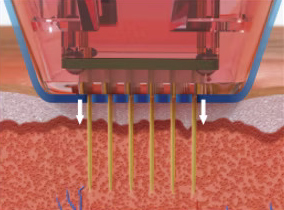 표피는 쿨링시키고 진피 조직에 고주파 에너지를 전달하여 피부 속 조직을 응고시키는 원리를 사용하며, 피부재생 및 탄력 개선 효과를 유도합니다.